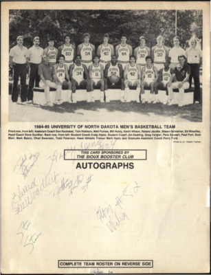 Autograph card for the 1984-1985 UND men's basketball team. The card features a team photograph and roster, as well as a schedule for the season.