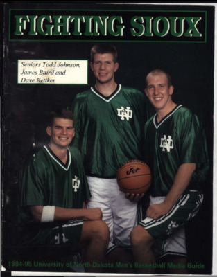 Media guide for the 1994-1995 UND men's basketball team. The guide contains information about the team and its coaches, and was sent to local and regional media outlets.