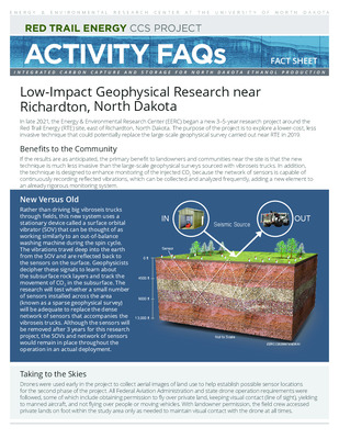 Fact sheet about a multi-year research project that explores a lower-cost, less invasive geophysical survey technique. Part of the Red Trail Energy carbon capture and storage research effort.