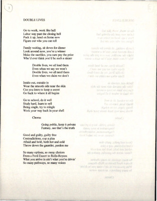 Song lyrics for "Double Lives" by Bill Gessner. Three pages total, including one double-sided sheet of paper. The double-sided pages include typewritten lyrics, with only minor variations. The third, single-sided page has typewritten lyrics, with handwritten notes and revisions, including guitar chords. All pages are undated. The song is about the "double lives" all people lead, including our public vs. private selves and the different lives we lead at home and work.