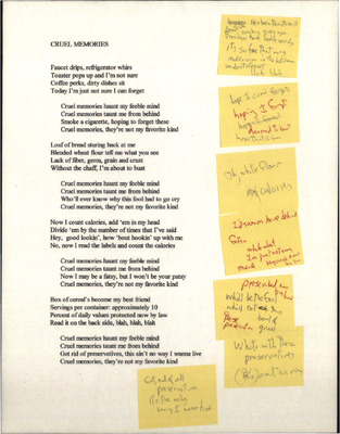 Song lyrics for "Cruel Memories" by Bill Gessner. Seven pages total, including one double-sided page. The typewritten pages include multiple versions of the lyrics, with some pages including handwritten marks and notes; some notes and suggested revisions appear on yellow post-it notes affixed to the sheets of paper. The song is at least partly concerned with changes and restrictions to diet.