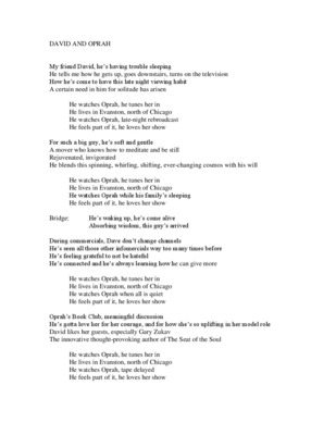 Song lyrics for "David and Oprah" by Bill Gessner. A song about David, who is Bill's friend, overly watching Oprah on television, to the point where he is losing sleep over it.