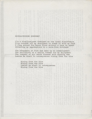 Song lyrics for "Disillusioned Downbeat" by Bill Gessner. Two pages on one sheet of paper. One side includes typed lyrics, and the other side is a copied page of "Civil Disobedience." The song follows a character who Gessner refers to as a "disillusioned downbeat" and makes several references to events/topics from the late 1970s, such as the discotheque and the Vietnam War.