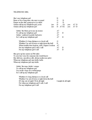 "Song lyrics for "Telephone Girl" by Bill Gessner. Five sheets of paper consisting of typed lyrics, along with guitar cords on the right side of the pages. The song has references about calling up a "telephone girl" and a possible relationship. The song states about the urges to call the telephone girl in the following lyrics:
