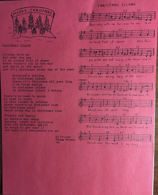 Song lyrics for "Christmas Island", by Bill Gessner. One sheet of paper with typed lyrics that included handwritten notes and guitar chords. He has no revisions written on the lyric sheet. The song "Christmas Island" is about a place where it is Christmas every day. Gessner talks about how he was inspired to write this song by his love of the Christmas season and Christmas music.