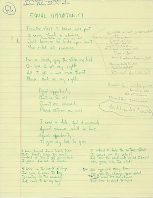 Song lyrics for "Equal Opportunity" by Bill Gessner. One sheet of paper with handwritten lyrics that include multiple versions for the chorus, as well as notes and light revisions in the margin. Gessner performed this song live on April 25th, 1981. The song references relationships and unfulfilled romance.