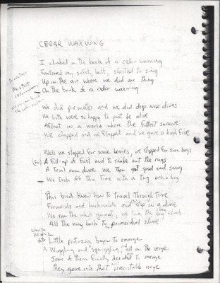 Song lyrics for "Cedar Waxwing" by Bill Gessner. One sheet of paper, handwritten on both sides. It also includes many inserted revisions. The song is a metaphorical description of human civilization from the ancient to the modern. Going back and forth, Gessner talks about different animal species, such as dinosaurs and birds.