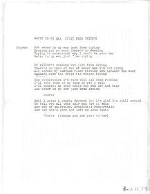 Song lyrics for "Water In My Ear". One page of typewritten lyrics with the date written in the bottom right corner. The lyrics paint a vivid picture of sorrow so intense it floods the bedroom, soaks the pillow, and sends water flying down the stairs. It's emotional, theatrical, and strangely relatable for anyone who's ever felt overwhelmed by love lost.