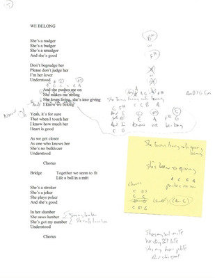 "Song lyrics for "We Belong" by Bill Gessner. The lyrics page consists of both typed and hand written lyrics, along with hand written notes. There is also numerous guitar cords on the page. The song talks about describing a woman and what her personality is like. The lyrics talk about how much he and the woman understand and belong together.