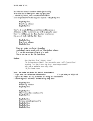 "Song lyrics for "Big Baby Boss" by Bill Gessner. Three pages which include typed lyrics, with alternative lyrics as well. However none of the pages include a date. The song references Big Baby Boss, and what he says to others.