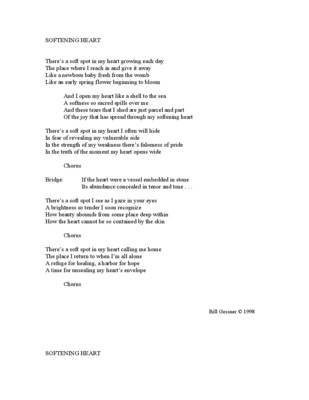 Song lyrics for "Softening Heart" by Bill Gessner. Three pages of typed lyrics from a word processing program. The second page indicates that the end of the second page and the entirety of the last page are the original version of the song, before revisions. The second page also consists of chords for him to play on the guitar. His lyrics speak of his heart and how it is growing fonder.