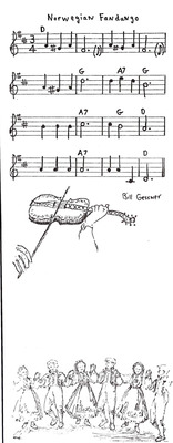 Bill Gessner (1947-2019) was a UND alumni and an amateur musician. This is music for one of his songs titled "Norwegian Fandango." It is a short instrumental piece played on guitar. The music sheet has an illustration of several people (presumably Norwegians), doing the fandango.
