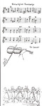 Sheet music for "Norwegian Fandango", by Bill Gessner. The music appears to be hand-written, with a written in chord progression and a basic melody. There are no lyrics, as this song is purely an instrumental. There are two drawings on the document, one of a person playing what appears to be a violin, and another of a group of people smiling and dancing.