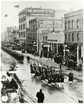 Photograph taken taken on Third Street looking northeast . A lot of people are standing along the street in front of stores are watching as the parade goes by. Businesses in the background are the Ontario Store, McGrath Pharmacy, M.G. Olson Clothing, and the Hotel Ryan.