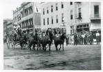 Photograph of a parade heading south east down Fourth Street passing the Ingalls Hotel, ca. 1907. A large crowd of onlookers can be seen lining the street as a horse drawn carriage in the parade passes by.