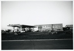 Photograph of the Holiday Inn in 1974. The Red Velvet Restaurant sign is displayed on the hotel's portes-cochères. There are multiple cars parked in the parking lot and near the entrance.