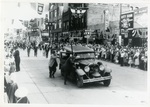 Photograph of Shriner's Parade in June 1954, North Third Street looking toward intersection with DeMers Ave. Large crowd of people are standing in front of business's along the street watching as the floats pass by. At the front of the parade two Shriners are trying to get into a car that appears to still be moving.In the background many businesses and apartments can be seen such as McGuire's, Star Cut Rate Drugs Inc., Waterbury's Jewelry, Dotty Dunn Hat Shop, Griffith R B Co Department Store, Ontario Store, and Routtell Apartments.