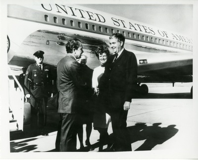 Photograph of President Nixon after deboarding the plane at the Grand Forks Airport. Nixon is shown shaking hands with Representative Mark Andrews, while Andrews' wife, Mary, stands between besides him next to an unknown person. The president's private plane sits in the background with one Secret Service man standing besides the stairs of plane.