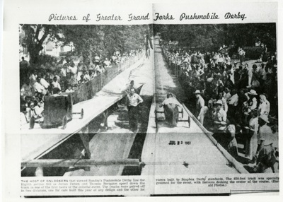 Photograph and citation from the Grand Forks Herald on July 23, 1951 taken from the Greater Grand Forks Pushmobile Derby. Citation reads, " The Host of onlookers that viewed Sunday's Pushmobile Derby line the Eight Avenue hill as James Dehen and Thomas Berquam speed down the track in one of the first heats of the colorful event. the youths were paired off in two divisions, one for cars built this year of any design and the other for racers built to Soapbox Derby standards. The 640-foot track was specially groomed for the event, with festoon decking the center of the course. (Herald Photos)