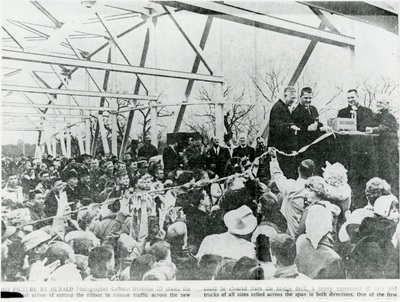 A large audience jams around the speakers stand, at upper right, Harold D. Shaft, master of ceremonies, opens the dedication ceremony Saturday on the deck of the new Skidmore Avenue bridge.