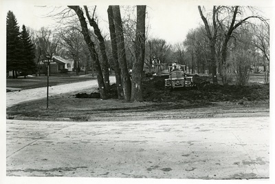 Photograph shows where the 1971 dike project rounds the corner from Lewis Boulevard onto Park Avenue. A small unknown construction crew of two men are operating the machinery being used at the time of picture being taken.
