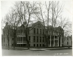 The side of the hospital that runs along Belmont Avenue has a balcony on the second and third floor; while the front of the hospital, has three baloneys, one on each floor. The hospital's name is placed on the lower edge of the second floor balcony in front of entrance. On the corning of the building about 3/4 up on the first floor there is a metal street sign attached to the brick. The reads "Belmont Ave." on the left side and "Fourth St." on the right. There does not appear to be a street sign located on the corner of the block.