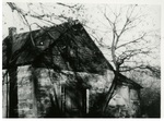 This photograph was taken sometime around 1960. The cabin appears to be dilapidated and without occupants. There are a few small trees surrounding the building with one larger partially shown in the left hand side of photo. A few straggling leaves are left on branches and many on the ground.