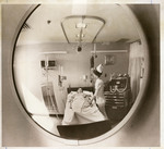 A reflected image of a female patient in a hospital bed. She has a cannula inserted nasally for supplemental oxygen as well as an intravenous (IV) drip in her arm. A nurse stands beside the bed holding the patient's wrist, probably taking her pulse rate. Medical apparatus sit atop a drawered cart are near the bed. The time on a wall clock reads 12:00 (in reverse). The image is in a sepia monochrome.
