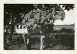 A collection of unknown individuals bide their free time in the shade in the yard of a small house. Title taken from photographer's original album.