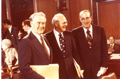 Senators Quentin Burdick (left) and Milton Young (right) visit with Thomas Kleppe (middle) during Kleppe's Senate confirmation hearing in November 1975.
