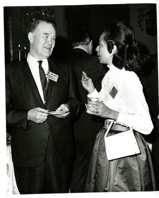 Senator Quentin Burdick visits with Maria Cole at a 1969 Reception for the National Committee for the Recording Arts. Maria Cole was married to singer and actor Nat King Cole from 1948 until his death in 1965.
