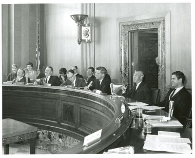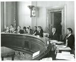 Photograph of a meeting of the U.S. Senate's Post Office and Civil Service Committee in Fall 1969. Senator Quentin Burdick is second from left in the front row.