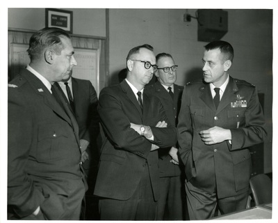 Rolland Redlin visits with several unidentified officials from the Minot Air Force Base in 1964. Redlin served in the U.S. House of Representatives from 1965 to 1967 and in the North Dakota State Senate from 1973 until 2000.