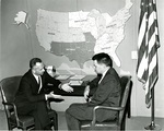 Representative Rolland Redlin (left) visits with Norman Clapp of the Rural Electrification Administration (REA). A U.S. map of the REA regions and an U.S. flag are in the background.