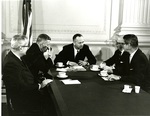 Representative Rolland Redlin (center) visits with several members of the LBJ administration. To Redlin's left is John Gronouski, the Postmaster General, while Secretary of State Orville Freeman is at the far right. The remaining two people are unidentified.