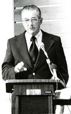 A photograph of Homer Engelhorn, Manager of the Garrison Diversion Conservancy District, in 1977. Garrison Diversion sought to divert water from the Missouri River and Lake Sakakawea in western North Dakota to eastern North Dakota.