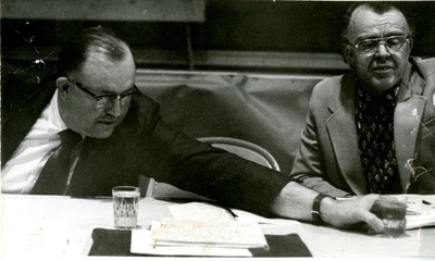 State Representatives Ken Knudson of Taylor and Ted Hardmeyer of Mott defending changes to the North Dakota Constitution at a meeting in Regent in the Spring of 1972. (information taken from the back of the photograph)