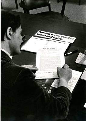 Myron Just, the North Dakota Commissioner of Agriculture, signs the state's Wheat Pool contract in March 1976. (information from back of photograph)