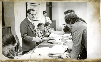 "State Representative William Gackle, center, confronts newsmen following heated meeting on percentage severance tax, legislative session, 1977. Gackle chaired House Finance and Tax Committee. Interviewing him are Dennis Neumann, KFYR, with microphone, and Mark Schwartzell, KFYR. Others, left to right, Jim Willis, Associated Press, Roberta Rose (Committee Clerk), Al Hausauer (Committee Vice-Chair), Daniel Hennessey (Committee Intern), Mike Dwyer (Intern)." (from back of photograph)