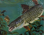 A Northern Pike is pictured preying on a small Perch underwater. The artist also depicts plants that make the scene look like a realistic Minnesota lake floor.