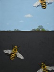 A minimalistic landscape with a white house in the distance, a vast blue sky with clouds, and a large grey foreground. There are three large bees across the canvas that make the landscape in the distance seem even smaller.