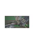 A detailed hawk with pilots goggles and a leather hat against an olive background with green stripes.