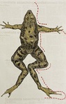 A print of a frog showing its back with red lines around its limbs and words from a scientific article in the background in pale lettering.