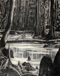 A dark monochromatic landscape of a swamp with trees.
