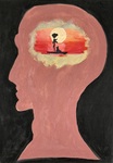 The silhouette of a head with a sunset and military weapon in the middle on a back background.